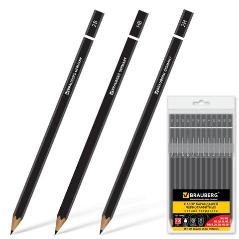 Карандаши чернографитные разной твердости НАБОР 12 штук, 5H-5B, BRAUBERG "Line", 180652