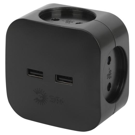ЭРА Б0049536 Разветвитель электрический SP-4-USB-B на 4 розетки 220V + 2xUSB 2400mA, без заземл 10А (черный)