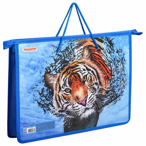 Папка на молнии с ручками ПИФАГОР А4, 1 отделение, пластик, ручки-шнурок, "Wild cat", 270864