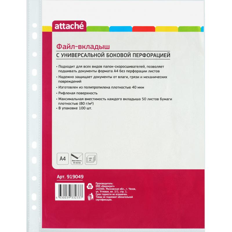 Файл-вкладыш А4 40мкм Attache с перфорацией,100 шт., рифлен.пов