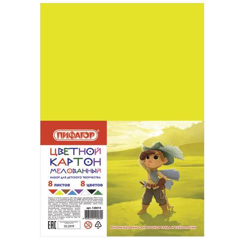 Картон цветной А4 МЕЛОВАННЫЙ (глянцевый), 8 листов 8 цветов, ПИФАГОР, 200х283 мм, "Мушкетер", 128014