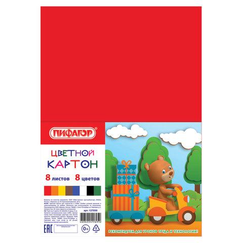Картон цветной А4 немелованный (матовый), 8 листов 8 цветов, ПИФАГОР, 200х283 мм, 127050