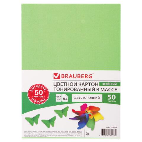 Картон цветной А4 ТОНИРОВАННЫЙ В МАССЕ, 50 листов, ЗЕЛЕНЫЙ, 220 г / м2, BRAUBERG, 210х297 мм, 128984