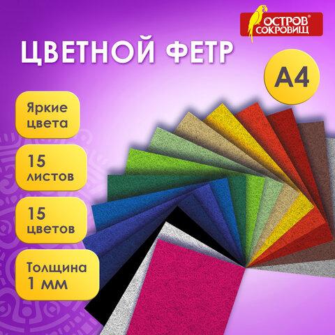 Фетр жесткий А4, 1 мм, 15 листов, 15 цветов, плотность 160 г / м2, ОСТРОВ СОКРОВИЩ, 665668