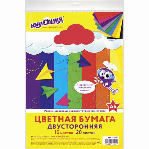 Цветная бумага А4 ТОНИРОВАННАЯ В МАССЕ, 20 листов, 10 цветов, 80 г / м2, ЮНЛАНДИЯ, интенсив, 129307