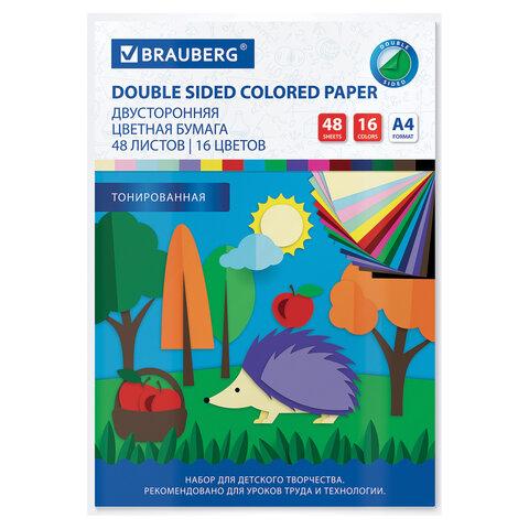 Цветная бумага А4 ТОНИРОВАННАЯ В МАССЕ, 48 листов 16 цветов, склейка, 80 г / м2, BRAUBERG, 113504