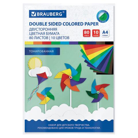 Цветная бумага А4 ТОНИРОВАННАЯ В МАССЕ, 80 листов 10 цветов, склейка, 80 г / м2, BRAUBERG, 113503