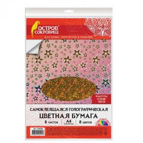 Цветная бумага, А4, ГОЛОГРАФИЧЕСКАЯ САМОКЛЕЯЩАЯСЯ, 8 листов 8 цветов, ОСТРОВ СОКРОВИЩ, "ЗВЕЗДЫ", 129286
