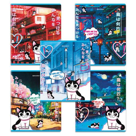 Тетради ДЭК А5 48 л. КОМПЛЕКТ 5 шт. BRAUBERG, скоба, клетка, матовая ламинация, лак, "Аниме Кот", 404671