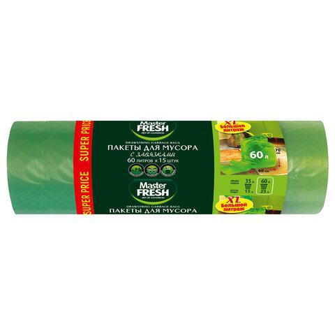 Мешки для мусора 60 л, с завязками, 70х60 см, XL, зеленые, 14 мкм, 15 шт., Master FRESH