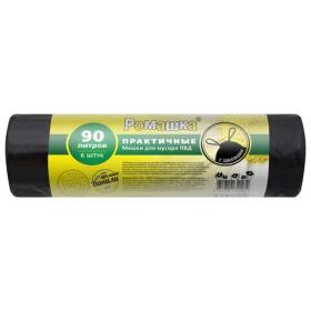 Мешки для мусора с завязками 90 л, черные, в рулоне 6 шт., ПВД 45 мкм, 75х85 см, РОМАШКА, ЗВП-90 / 6 / 15Ч