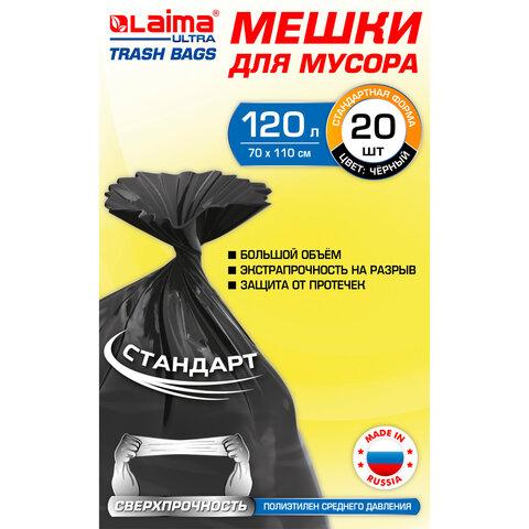 Мешки для мусора LAIMA "ULTRA" 120 л, черные, рулон 20 шт., сверхпрочные, ПСД 60 мкм, 70х110 см, 607697