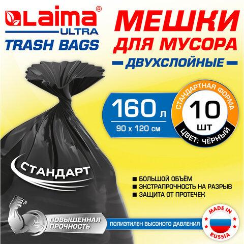 Мешки для мусора LAIMA "ULTRA" 160 л черные, рулон 10 шт. прочные, ПВД 30 мкм, 90х120 см, 607694