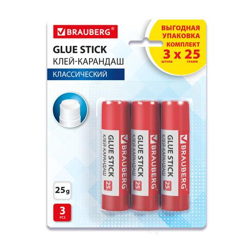 Клей-карандаш 25 г ВЫГОДНАЯ УПАКОВКА BRAUBERG, 3 штуки на блистере, 271306