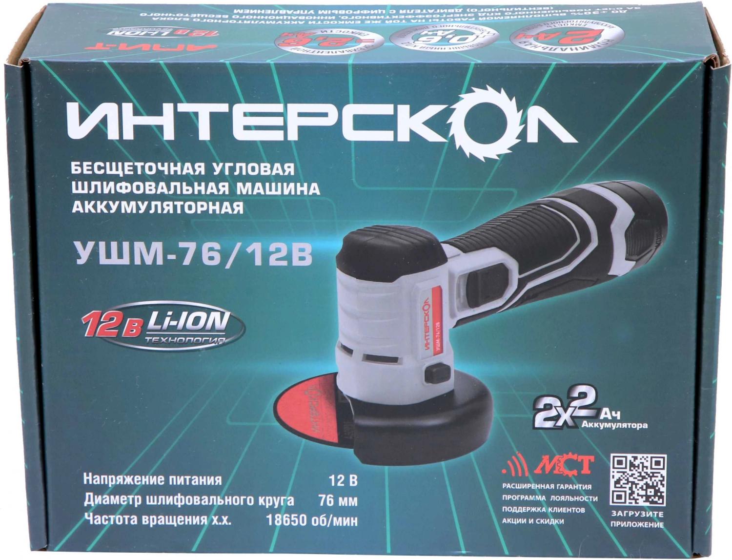 Углошлифовальная машина Интерскол УШМ-76 / 12В 18650об / мин рез.шпин.:M14 d=76мм (644.2.2.70)