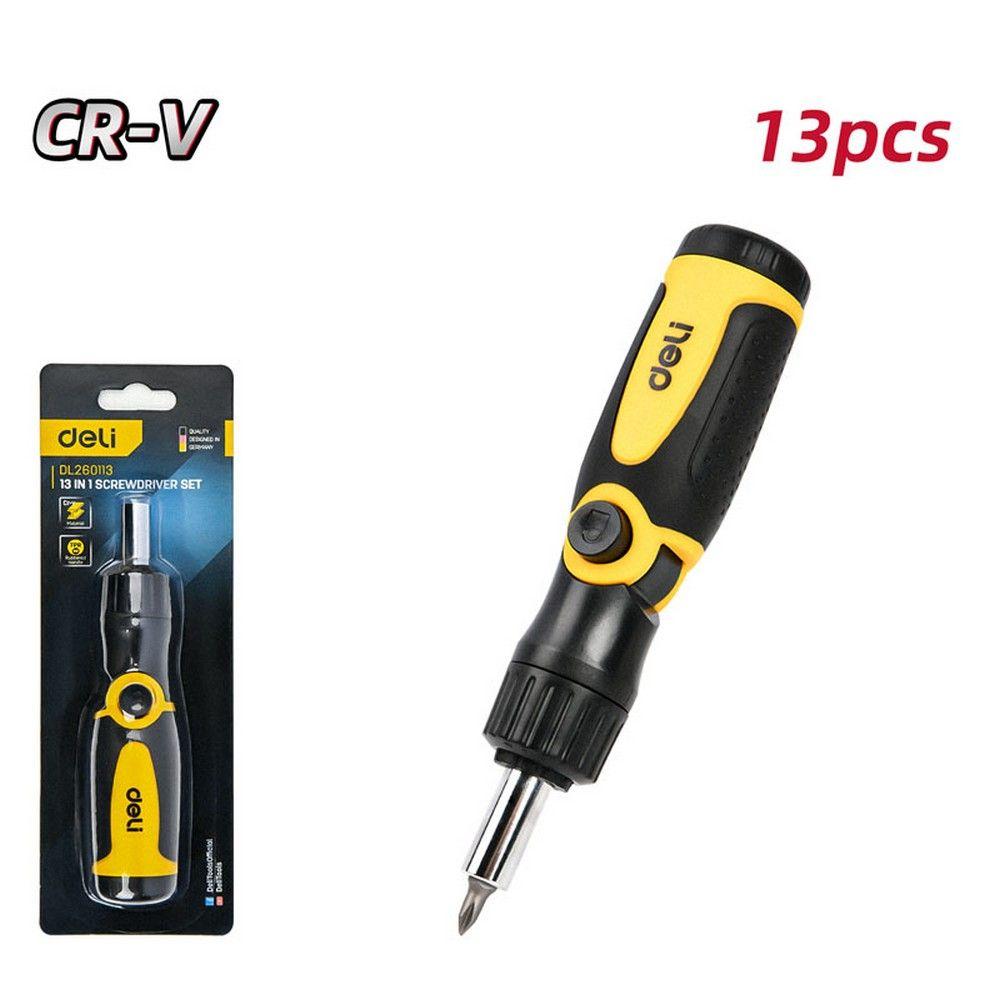 Многофункциональная отвертка с трещоткой 13-в-1 Deli DL260113 длина 165мм, 12 бит CrV, прорезиненная рукоять