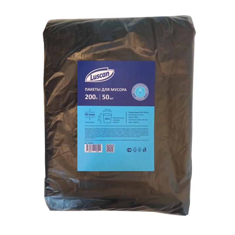 Мешки для мусора ПВД 200л 40мкм 50шт / уп черные 90х130см Luscan