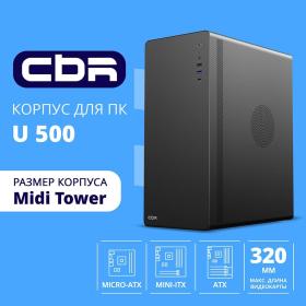 CBR Корпус ATX Miditower U500, без БП, 1*USB 3.0 Type-C, 1*USB 3.0, 1*USB 2.0, HD Audio+Mic, Black [PCC-ATX-U500-WPSU]