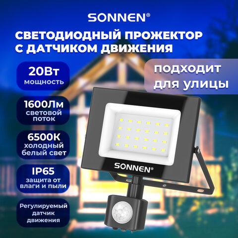 Прожектор светодиодный с датчиком движения 20 Вт, 6500 К, 1600 Лм, 20 м2, IP65, 122х146х51 мм, черный, SONNEN, 238416