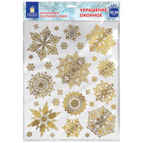 Наклейка для окон двусторонняя МНОГОРАЗОВАЯ 30х38 см, "Снежинки", фольга, золото, ЗОЛОТАЯ СКАЗКА, 591927