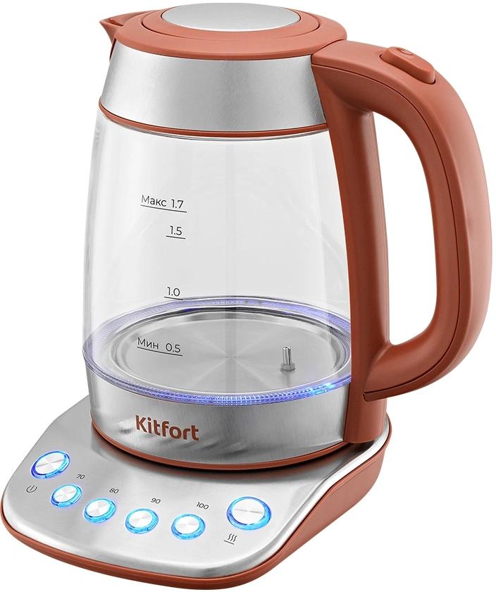 Чайник KITFORT КТ-690, 1,7 л, 2200 Вт, закрытый нагревательный элемент, LED дисплей, ТЕРМОРЕГУЛЯТОР, стекло, серебро