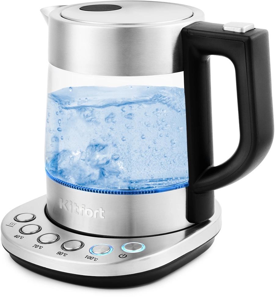 Чайник KITFORT КТ-690, 1,7 л, 2200 Вт, закрытый нагревательный элемент, LED дисплей, ТЕРМОРЕГУЛЯТОР, стекло, серебро