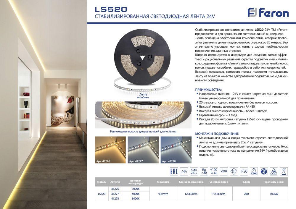 Лента светодиодная 24V FERON LS520, 120*SMD2835, 11W / m, IP20, 6000К (холодный белый), Кратность резки мм 100мм, 20000*10*1.22мм