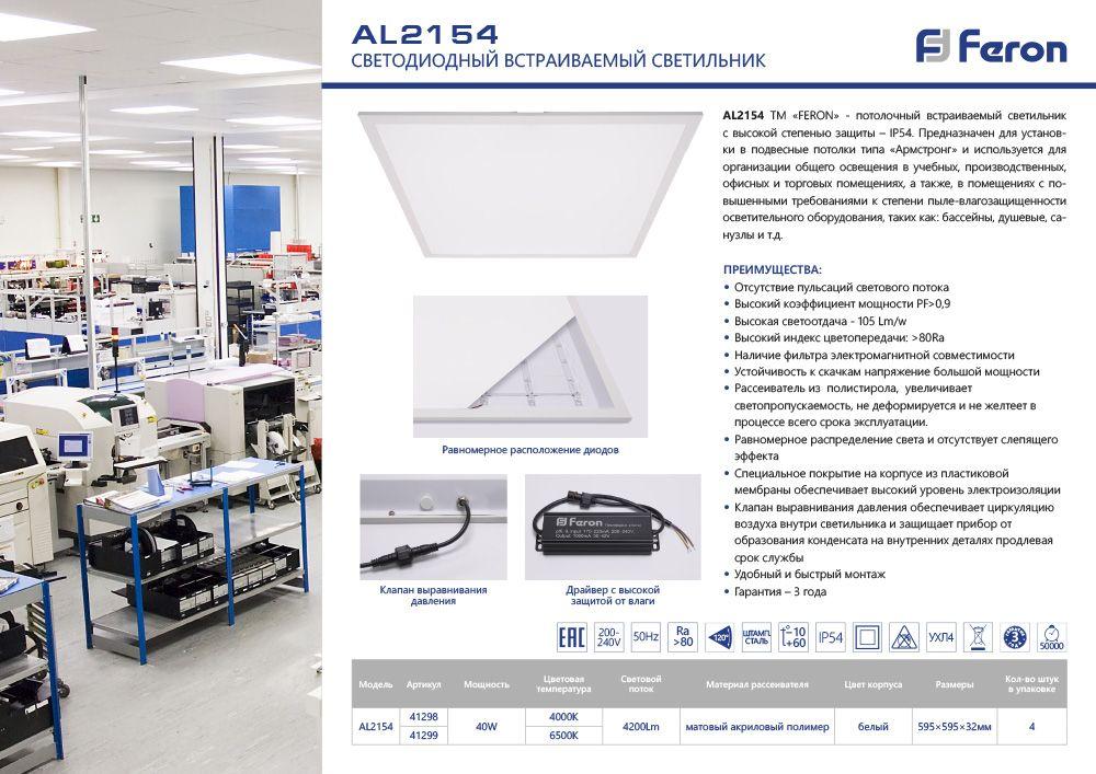 Светильник встраиваемый светодиодный, АРМСТРОНГ (ДВО) FERON AL2154, 40W 6500К (дневной), 200-240V, 4200Lm, IP54, угол рассеивания 120°, цвет белый, корпус штампованная сталь, рассеиватель матовый акриловый полимер, 595*595*32 мм, монтажн.отв. 595*595 мм.
