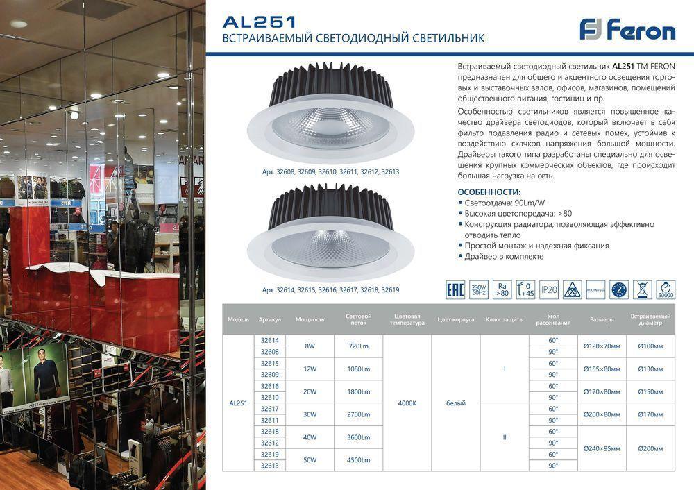 Светильник встраиваемый светодиодный, для торгового освещения (ДВО) FERON AL251, 30W 4000К (белый), 170-265V, 2700Lm, IP20, угол рассеивания 90°, цвет белый, корпус алюминий, рассеиватель стекло, 190*190*62 мм, монтажн.отв. 165*165 мм.