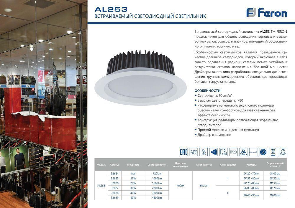 Светильник встраиваемый светодиодный, для торгового освещения (ДВО) FERON AL253, 40W 4000К (белый), 170-265V, 3600Lm, IP20, угол рассеивания 90°, цвет белый, корпус алюминий, рассеиватель матовый акриловый полимер, 230*230*76 мм, монтажн.отв. 205*205 мм.