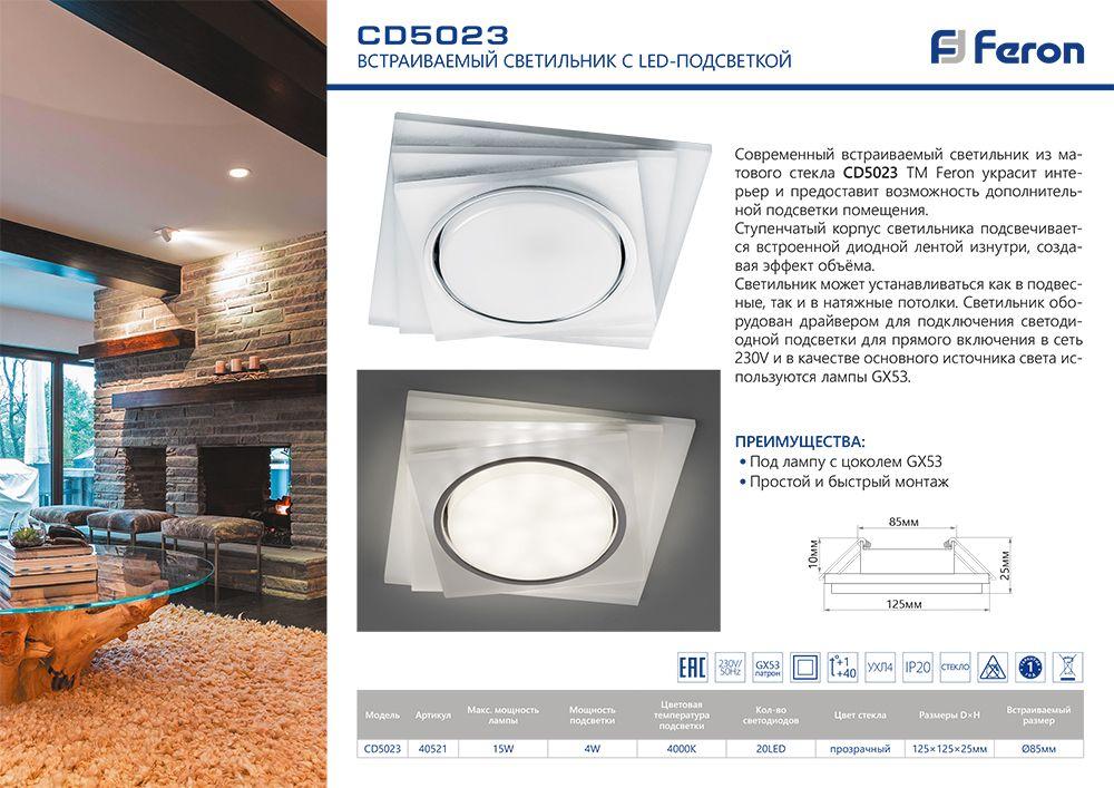 Светильник потолочный встраиваемый (ФВО) FERON CD5023, под лампу 20LED*2835 SMD 4000K, GX53 GX53, матовый хром, квадрат, 125*125*25 мм, монтажный диаметр 80мм, корпус стекло, неповоротный