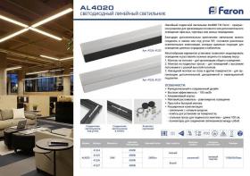 Светильник линейный светодиодный, (ДПО) FERON AL4020, 36W, 6500К (дневной), 180-265V, 3600Lm, IP20, цвет белый, корпус алюминий, рассеиватель пластик, 1180*70*55 мм