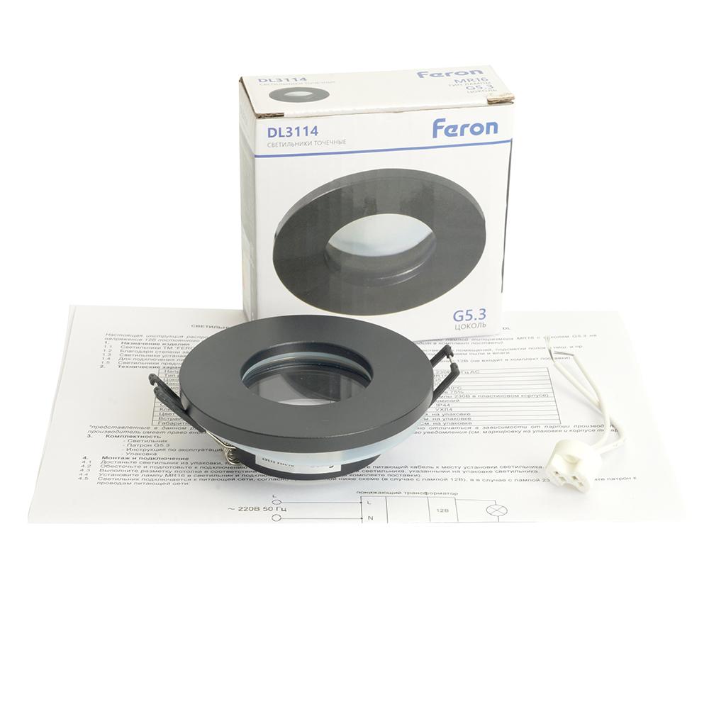 Светильник потолочный встраиваемый (ИВО) FERON DL3114, под лампу MR16 G5.3, черный, круг, 83*83*25 мм, монтажный диаметр 60мм, корпус алюминий, неповоротный