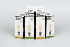 Лампа светодиодная филамент FERON LB-68, C35 (свеча) диммируемая, 5W 230V E14 2700К (белый теплый), рассеиватель прозрачный 530Lm, угол рассеивания 270°, 100*35мм