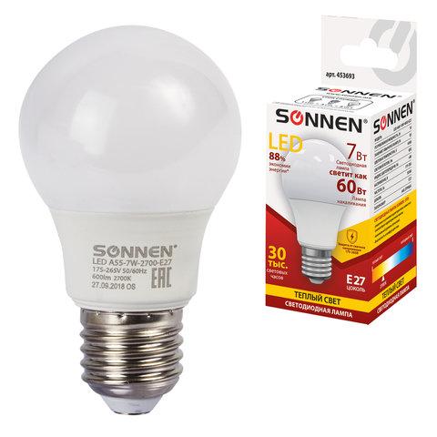 Лампа светодиодная SONNEN, 7 (60) Вт, цоколь E27, груша, теплый белый свет, 30000 ч, LED A55-7W-2700-E27, 453693