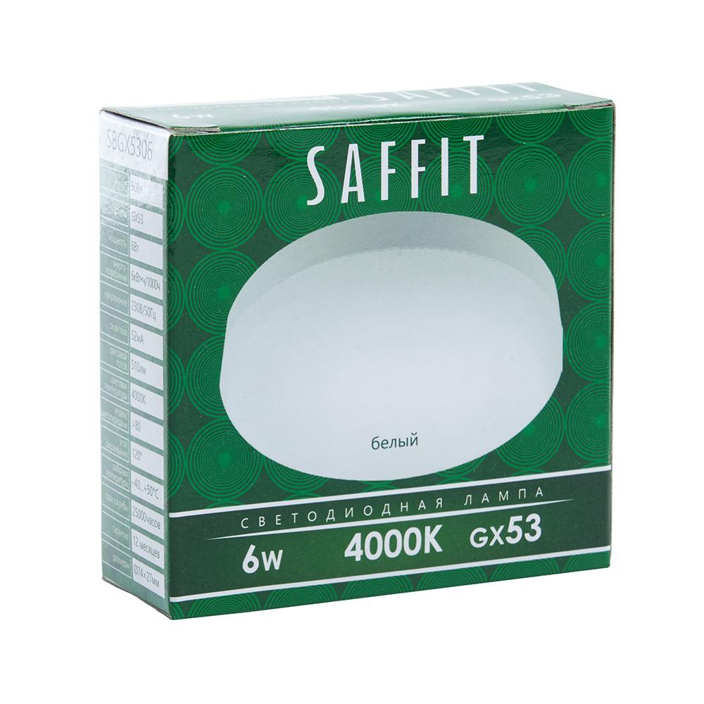 Лампа светодиодная SAFFIT SBGX5306, GX53 (таблетка), 6W 230V GX53 4000К (белый), рассеиватель матовый белый, 510Lm, угол рассеивания 120°, 26*74мм