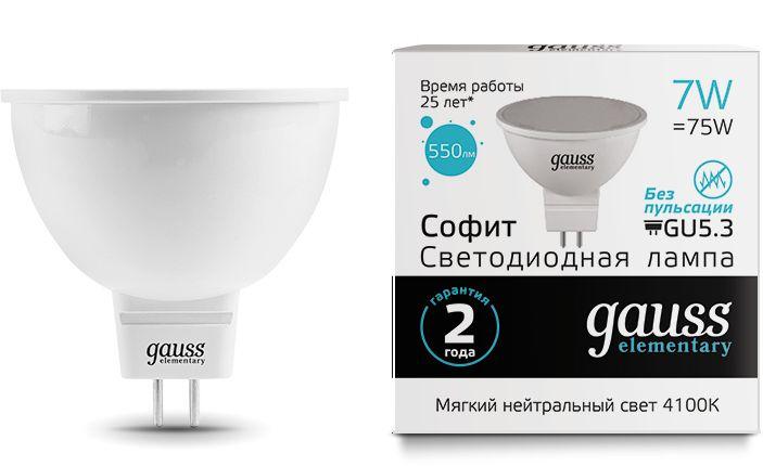 Лампа светодиодная Gauss Elementary MR16 7Вт цок.:GU5.3 спот 220B св.свеч.бел.нейт. MR16 (упак.:10шт) (13527)