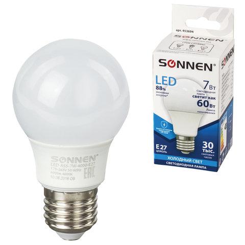 Лампа светодиодная SONNEN, 7 (60) Вт, цоколь Е27, груша, нейтральный белый свет, 30000 ч, LED A55-7W-4000-E27, 453694