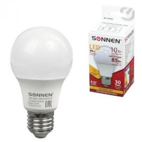 Лампа светодиодная SONNEN, 10 (85) Вт, цоколь Е27, груша, теплый белый свет, 30000 ч, LED A60-10W-2700-E27, 453695
