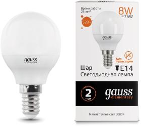 Лампа светодиодная Gauss 8Вт цок.:E14 шар 220B св.свеч.бел.теп. G45 (упак.:1шт) (53118)