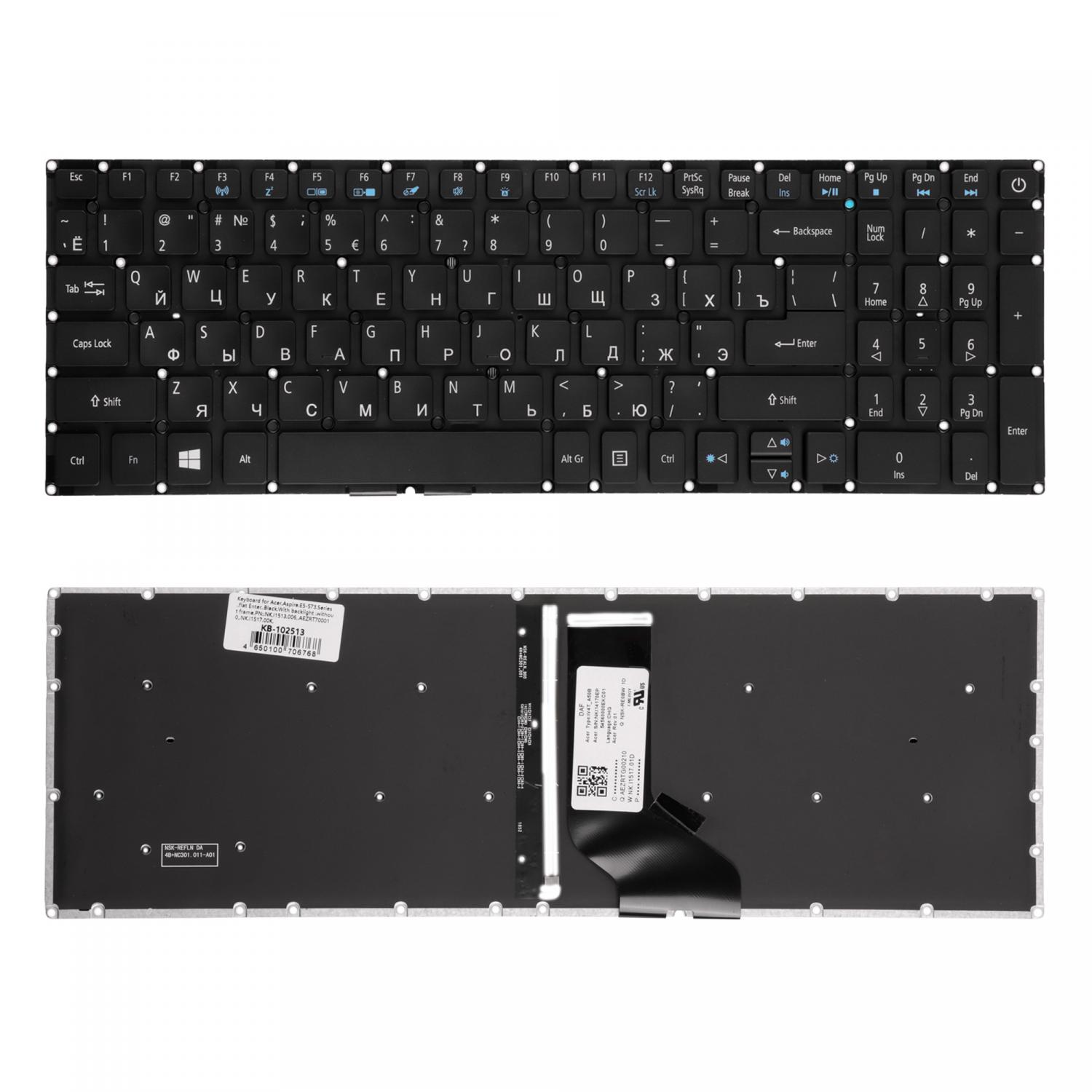 Клавиатура для ноутбука Acer Aspire E5-522, E5-573, E5-722 Series. Плоский Enter. Черная, без рамки. С подсветкой. PN: NK.I1513.006.