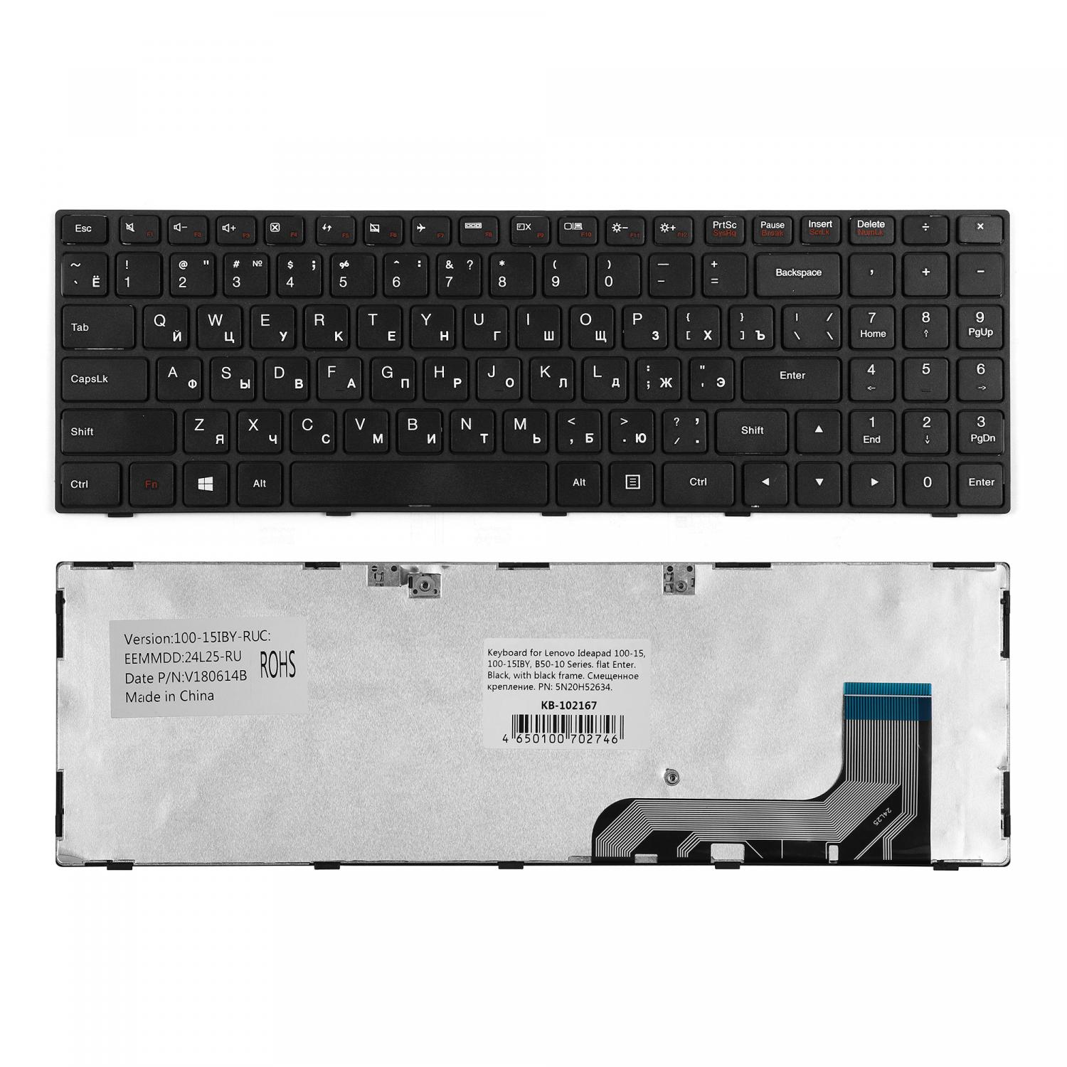 Клавиатура для ноутбука Lenovo IdeaPad 100-15, 100-15IB, 100-15IBY Series. Плоский Enter. Черная, с черной рамкой. Смещенное крепление. PN: SN20K65119