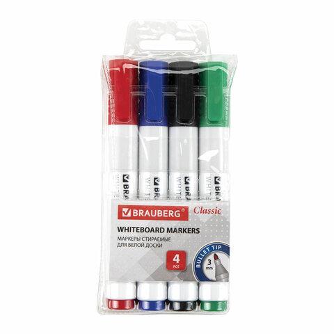 Маркеры стираемые для белой доски НАБОР 4 ЦВЕТА, BRAUBERG "CLASSIC", 3 мм, с клипом, 152117