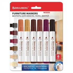 Маркеры для ремонта мебели и изделий из дерева, 6 ЦВЕТОВ, BRAUBERG WOOD, 152203