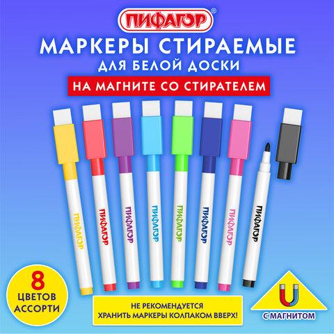 Маркеры стираемые 2 мм на магните со стирателем для белой доски и планера НАБОР 8 ЦВЕТОВ, ПИФАГОР, 152562