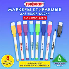 Маркеры стираемые 2 мм для белой доски и планера со стирателем НАБОР 8 ЦВЕТОВ, ПИФАГОР, 152566