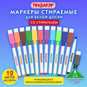 Маркеры стираемые 2 мм для белой доски и планера со стирателем НАБОР 12 ЦВЕТОВ, ПИФАГОР, 152565