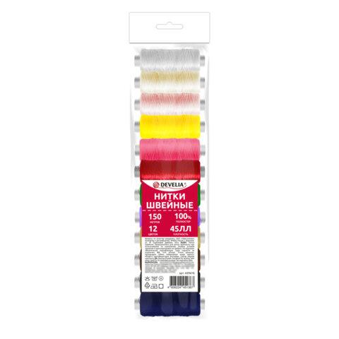 Нитки швейные 45 ЛЛ, 150 м, полиэстер, НАБОР 12 цветов, DEVELIA (Девелиа), 609618
