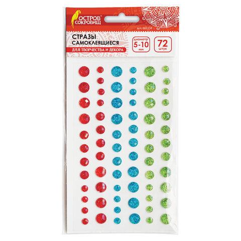 Стразы самоклеящиеся КРУГЛЫЕ, 5-10 мм, 72 штуки, блестящие, на подложке, ОСТРОВ СОКРОВИЩ, 662238
