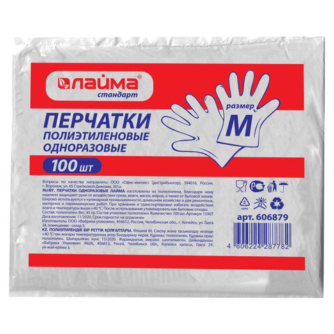 Перчатки полиэтиленовые одноразовые, КОМПЛЕКТ 50 пар (100 штук), размер М (средний), 6 микрон, LAIMA, 606879